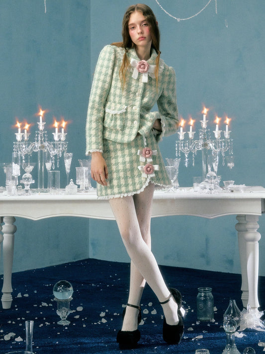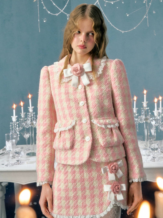 체크무늬 보우 플라워 브로치 레이스 패딩 숏자켓&스커트