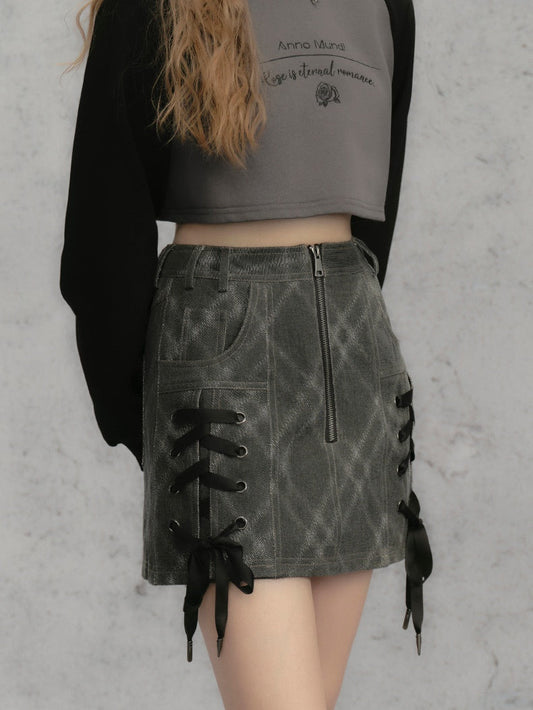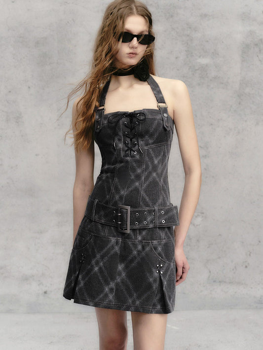 플레이드 데님 탈착식 스트랩 서스펜더 스커트