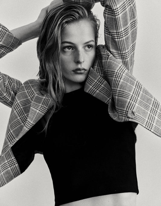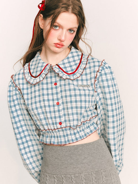 플레이드 인형 칼라 퍼프슬리브 셔츠