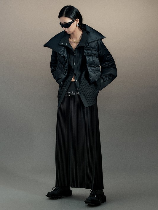 플리츠 시크 버튼 메탈니치 롱스커트