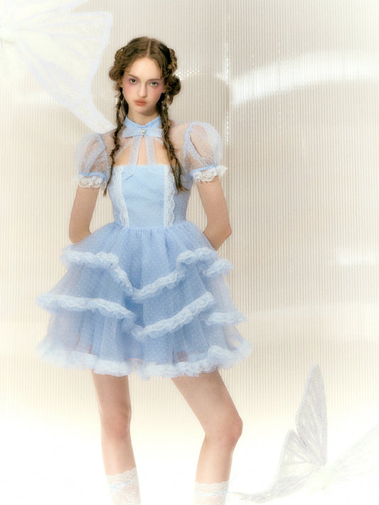 폴카 도트 라인스톤 리본 반팔 레이스 공주 드레스