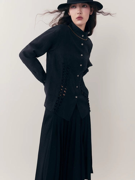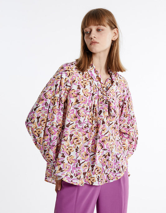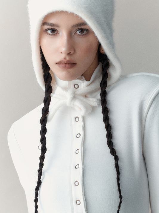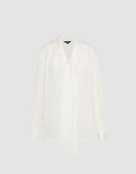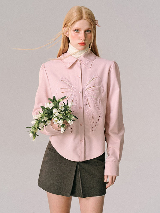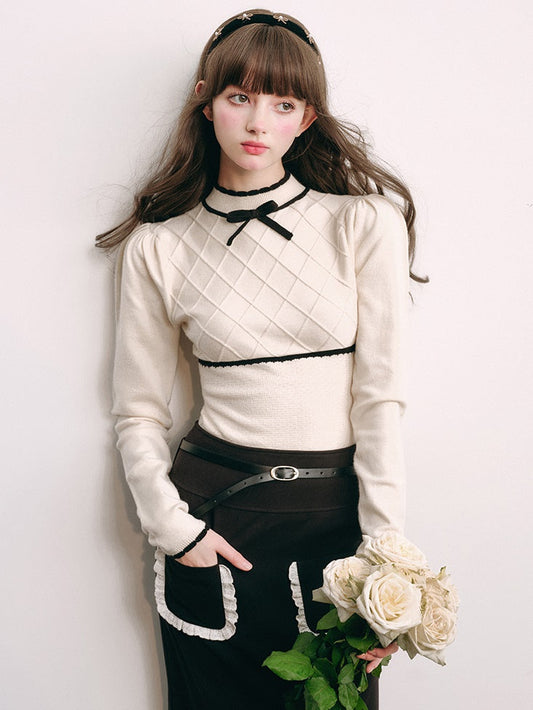 리본 장식 레이스 칼라 퍼프 슬리브 푹신한 셔츠