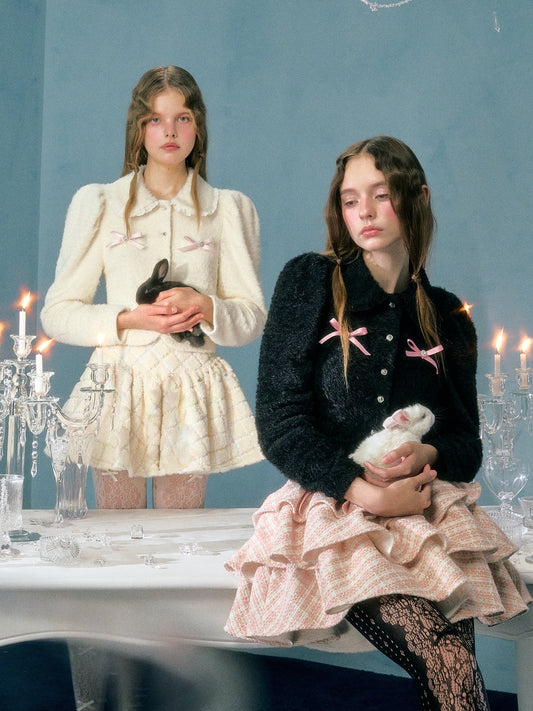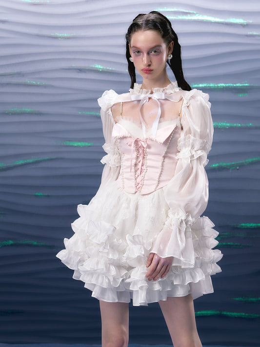 리본 레이스 퍼프 슬리브 긴 소매 쇼트 볼레로
