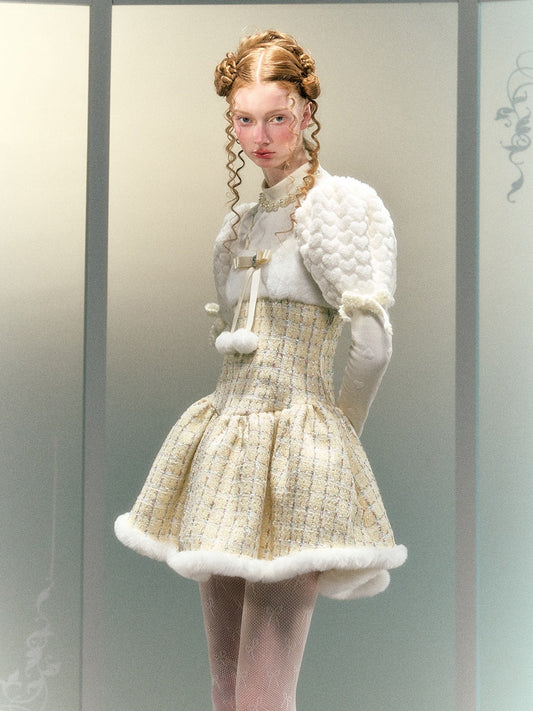 보우 플라워 브로치 퍼프 슬리브 드레스