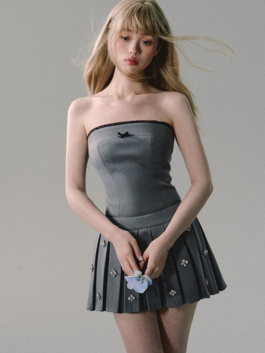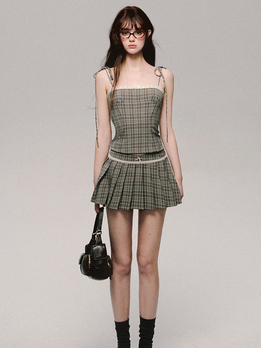 보우 체크 무늬 캐미솔 & 플리츠 쇼트 스커트