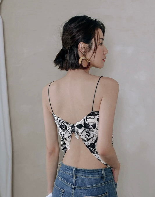 프린트 스카프 타이 캐미솔 탑 화이트/블랙 색상