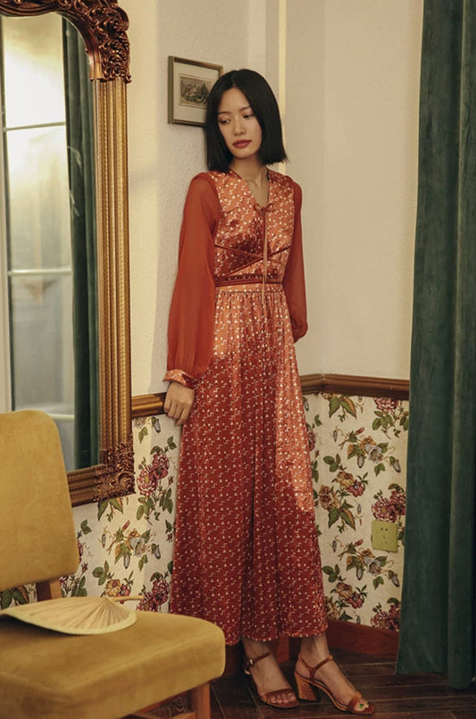 프린트 시어 슬리브 맥시 드레스(오렌지 색상)