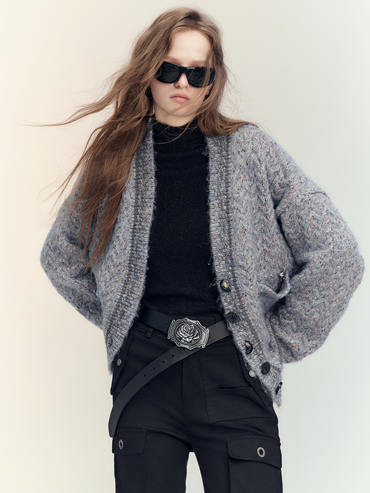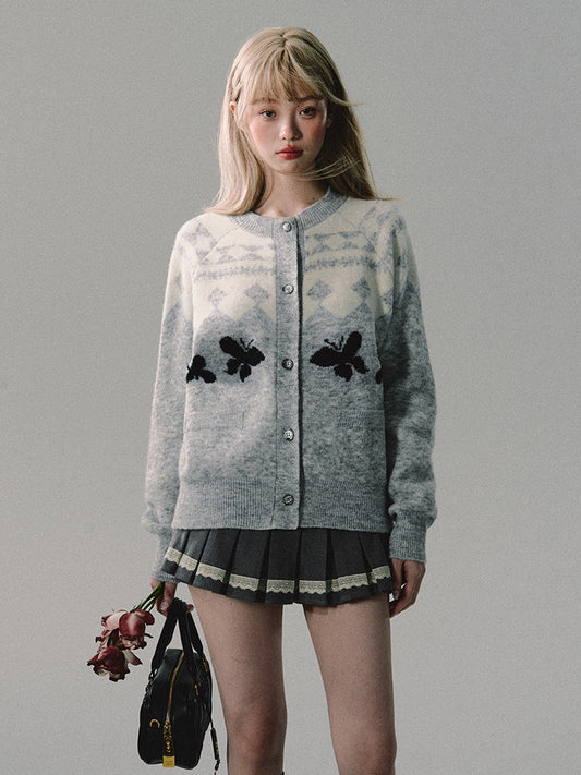 라운드 넥 자카드 배색 디자인 니트 가디건