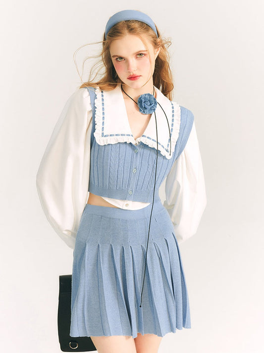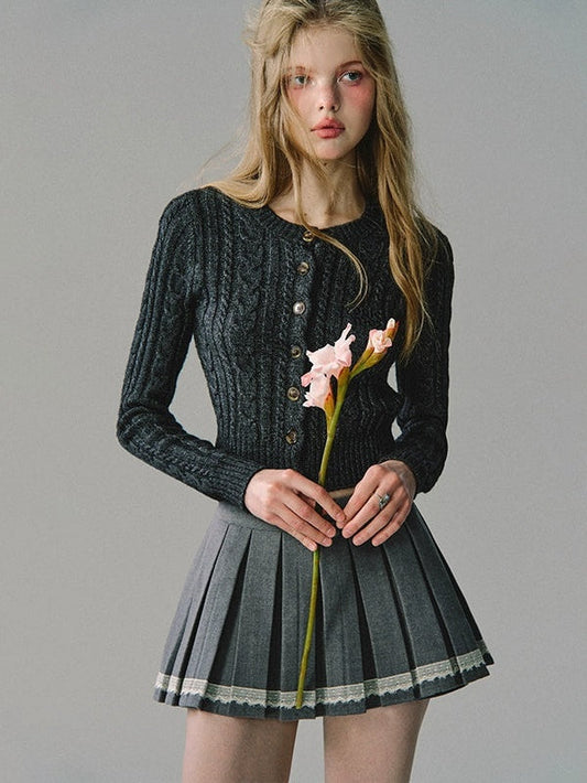 라운드 넥 보우 가디건 재킷 & 플리츠 스커트