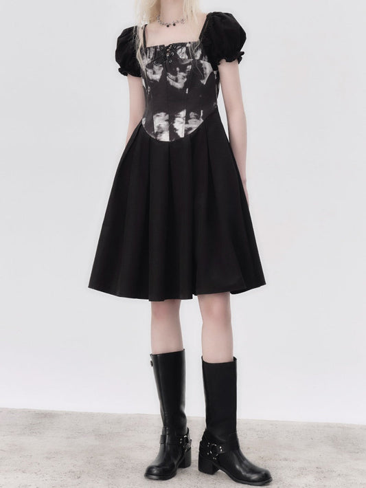 로즈 프린트 스퀘어 칼라 퍼프 슬리브 드레스