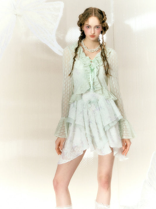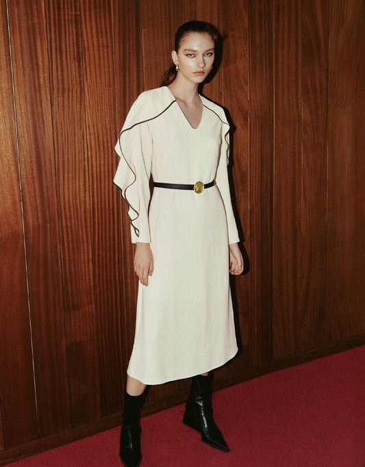 러플 레이스 스티치 플리츠 V넥 민소매 드레스