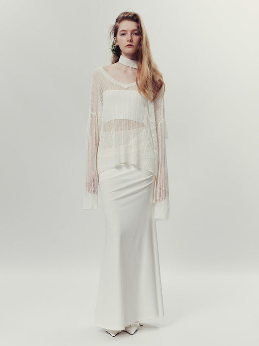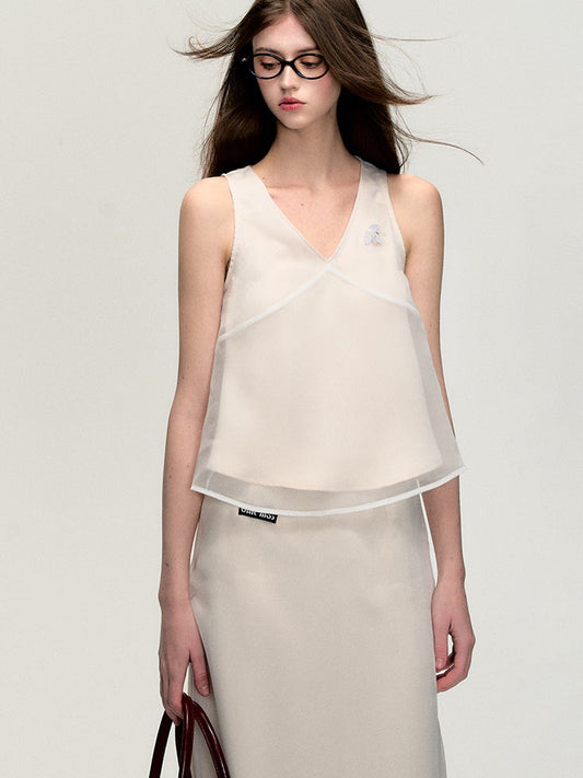 시어 레이스 시스루 산뜻한 브이넥 노슬리브 탑&스커트