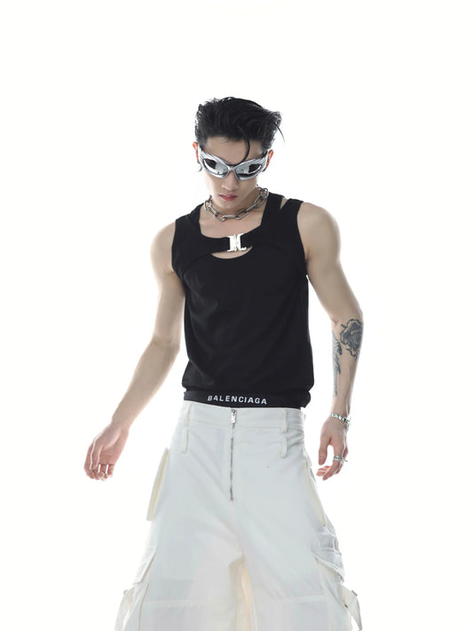 Split Shoulder Cut-Out Tank Top with Adjustable Metal Buckle Straps