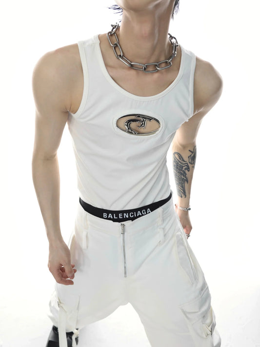 Sporty Slim-Fit Tank Top with Metallic Logo Cut-Out in Black & White