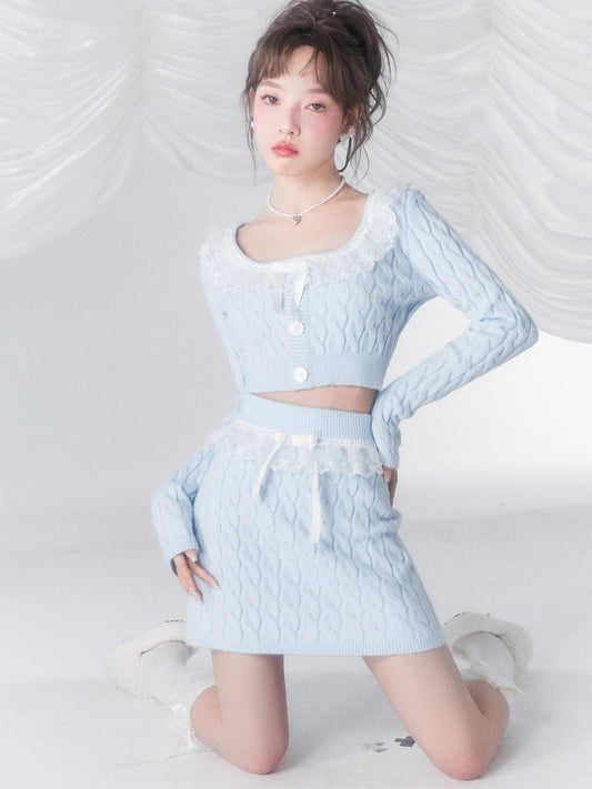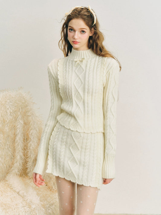 케이블 보틀넥 솜털 니트 스웨터 & 프릴 니트 스커트