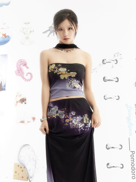 캣 프린트 홀팅 튜브 탑