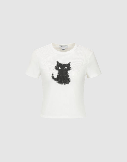 Cat Printed Crew Neck Skinny T-Shirt