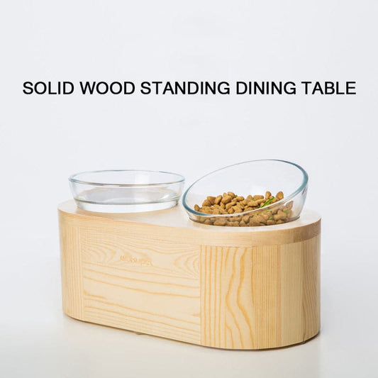 고양이 먹이 분지 이중 유리 그릇 단단한 나무 고양이 그릇 랙