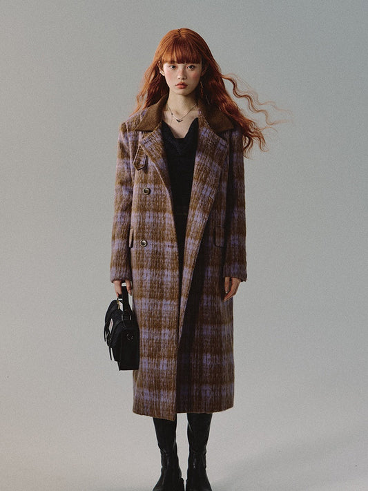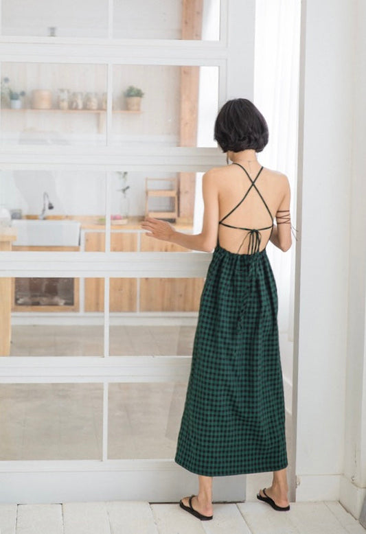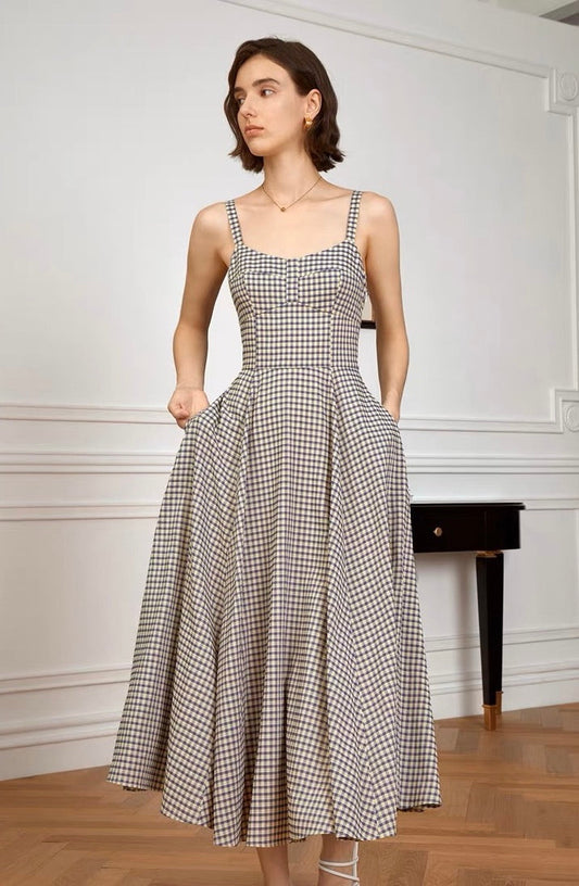 체크 보디스 포켓 스트랩 드레스 색상: 퍼플/크림