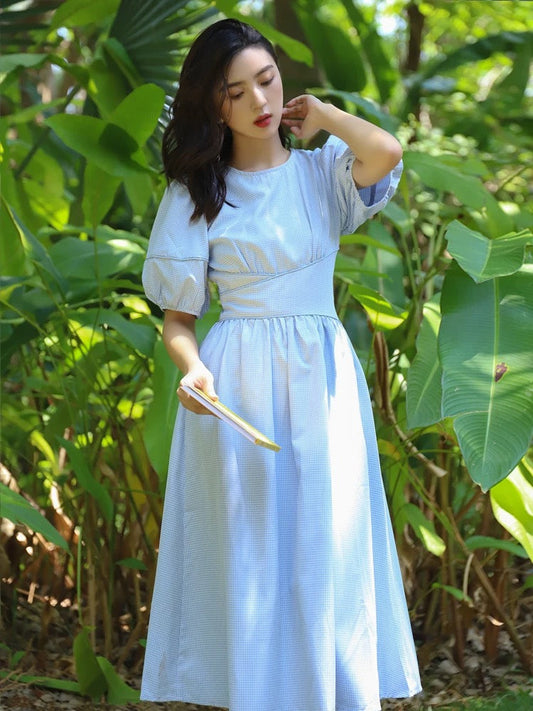 체크 퍼프 슬리브 미디 드레스블루 색상