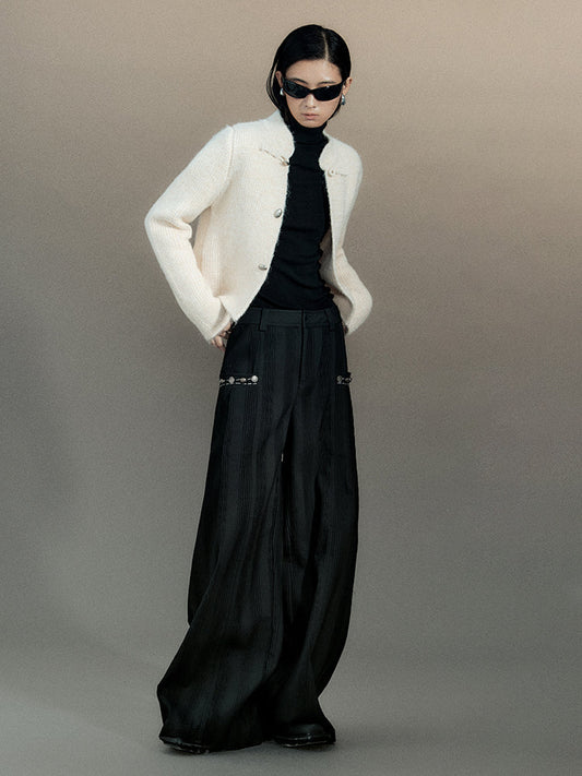 Chic White Wide Leg Pants with Spliced Zipper Detail and Split Hem