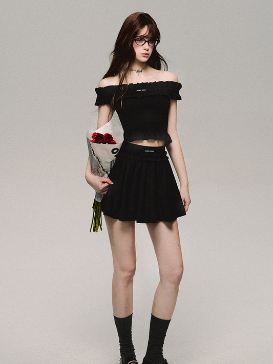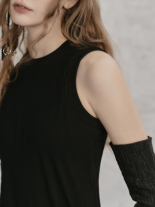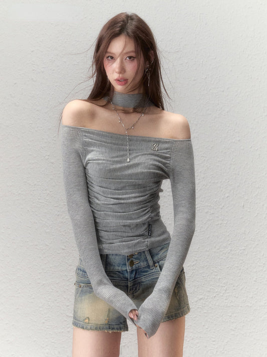 Chocker Neck Off-Shoulder Pleated Knit Top