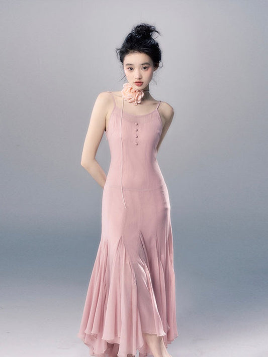 가슴 접어 배색 배색 스티치 서스펜더 롱 원피스
