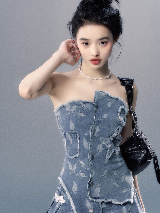 데미지 데님 베어탑 & 하이웨이스트 치마바지