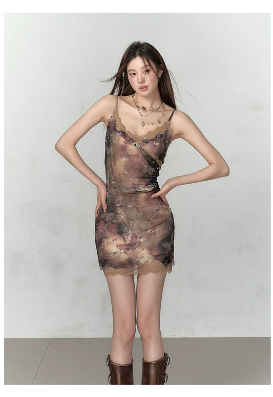 Dewdrop Butterfly Print Lace Patchwork Dress