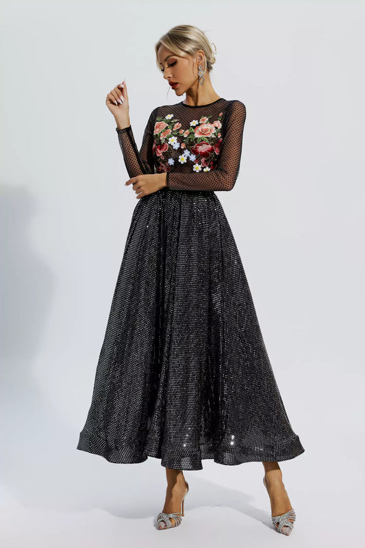Antonella 블랙 꽃무늬 자수 맥시 드레스