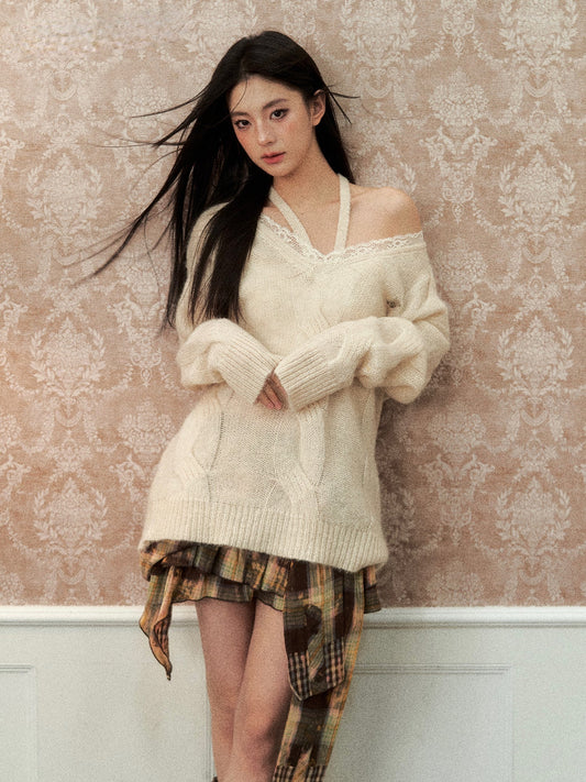 애프리콧 & 그레이 오프숄더 비대칭 스웨터