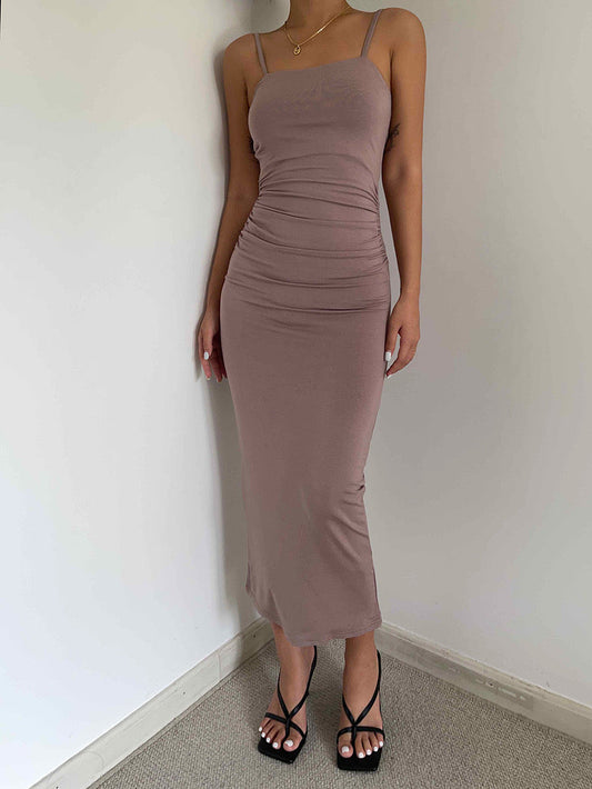 드롭 트위스트 백 바디콘 슈스트링 드레스(탠 핑크 색상)