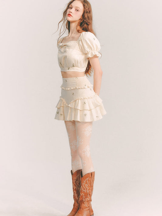 자수 티어드 퍼프슬리브 플라워블라우스&미니스커트