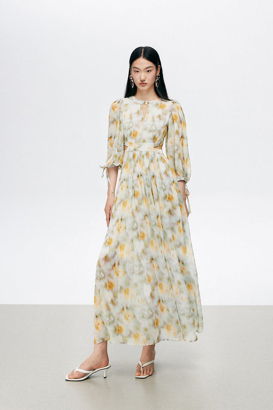 플로럴 블루종 사이드 컷아웃 맥시 드레스 옐로우 색상