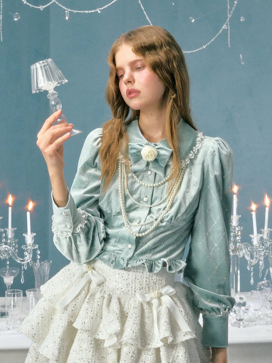 플로럴 & 비즈 레이스 브로치 플라워 퍼프 슬리브 셔츠
