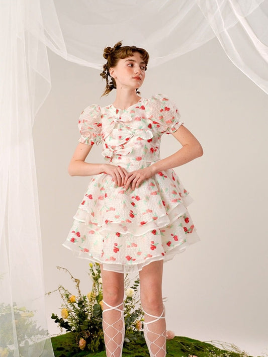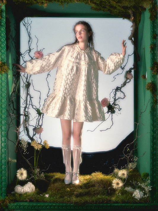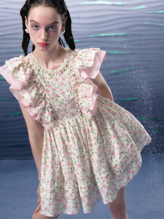 플라워 더블 레이어 러플 플라잉 슬리브 솜털 드레스