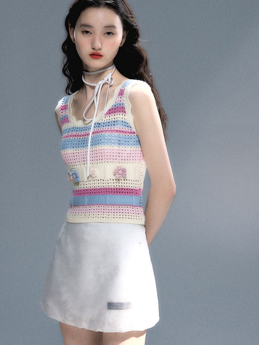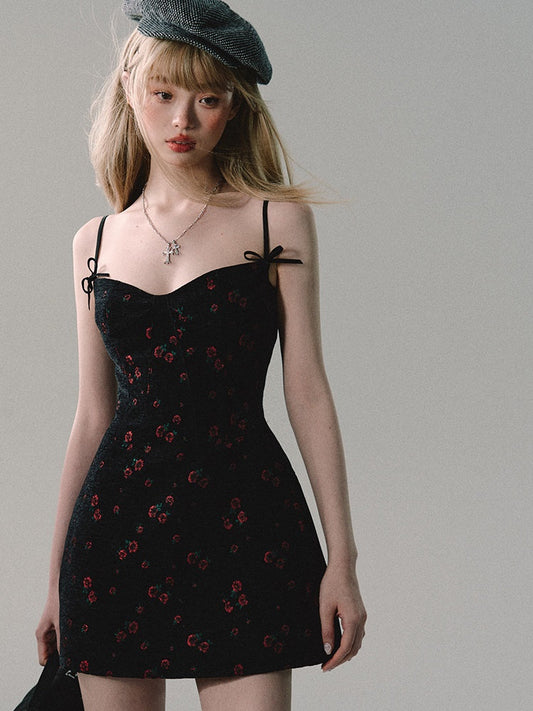 플라워 로즈 아이비 플리츠 쇼트 노슬리브 타이 드레스