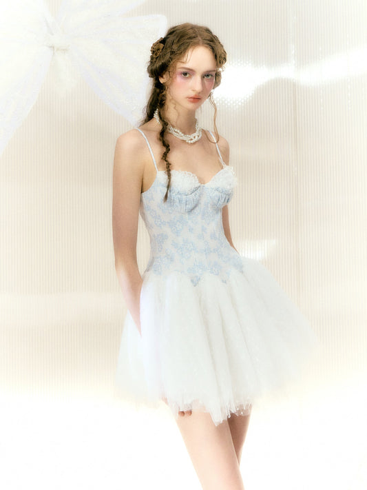 꽃 진주 나비 발레 스타일 메쉬 서스펜더 드레스