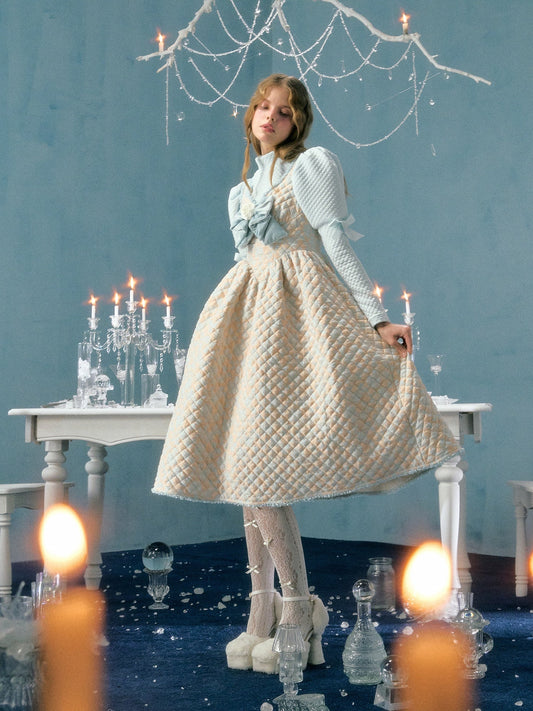 플라워 레이스 리본 브이넥 퀼팅 서스펜더 드레스 & 퍼프슬리브 탑
