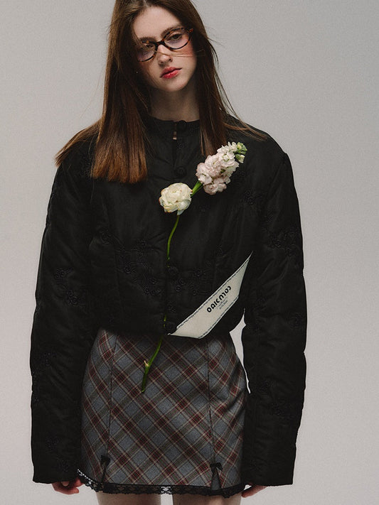꽃 자수 노카라 크롭 다운 재킷