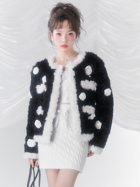 플라워 컬리 페이크 퍼 코트