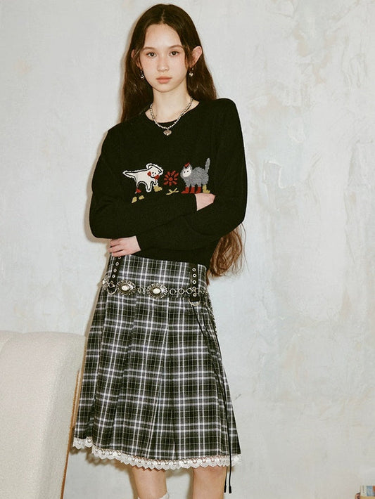 체크 스플라이싱 A라인 플리츠 쇼트 스커트