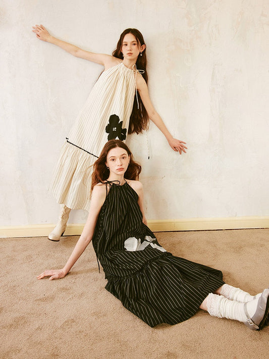 홀터넥 스트라이프 플라워 프린트 민소매 드레스