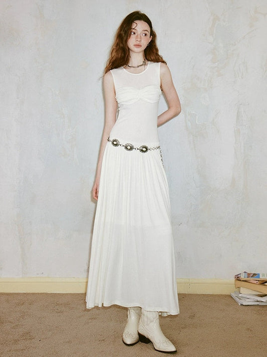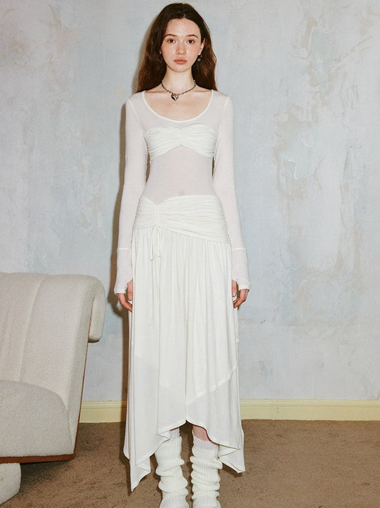 클래식 플리츠 스티치 긴소매 시어 드레스
