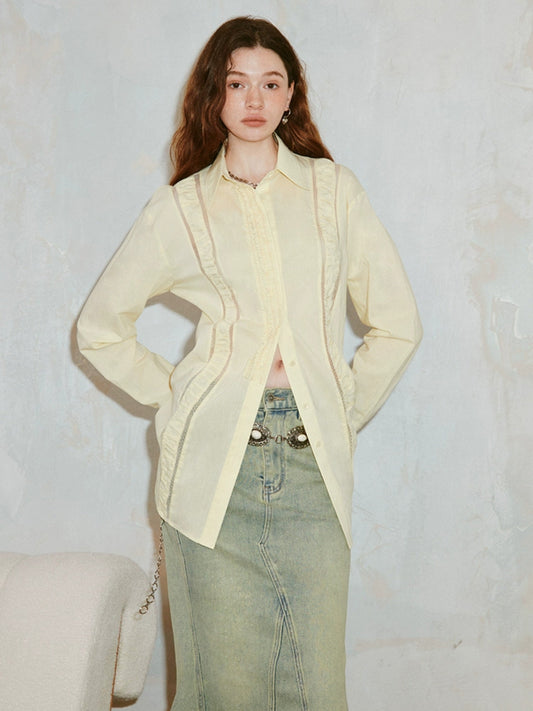 레트로 할로우 레이스 스티치 플리츠 셔츠