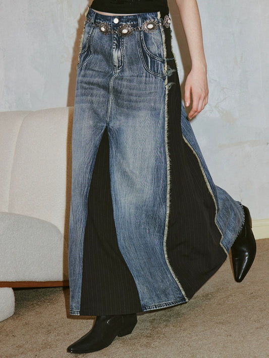 레트로 디스트레스드 워싱 로우 엣지 데님 패치워크 스커트