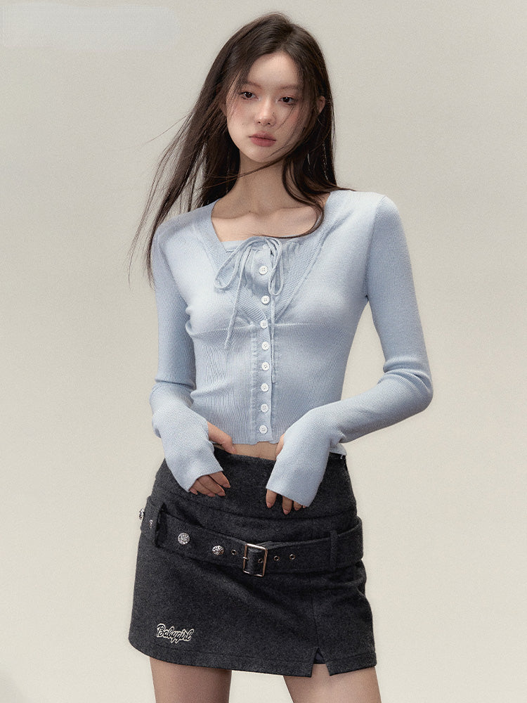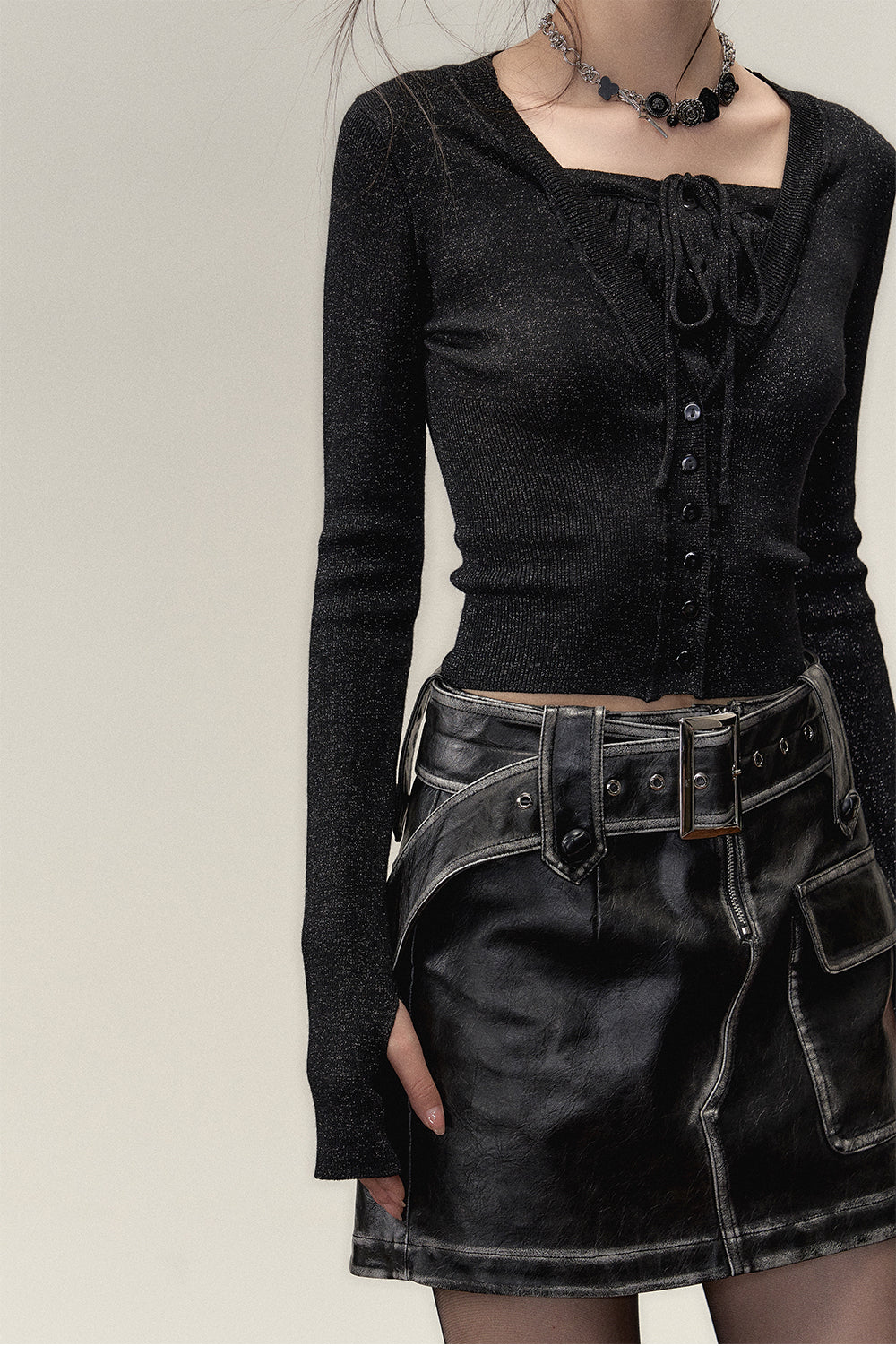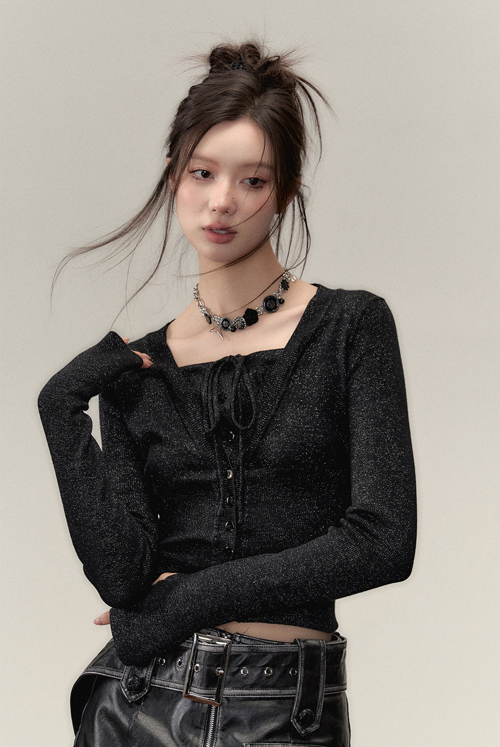 블랙 & 블루 2-in-1 짧은 니트 블라우스
