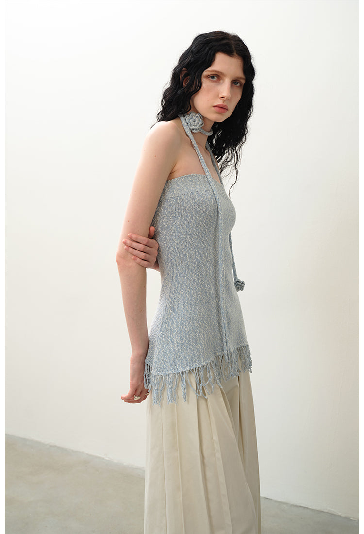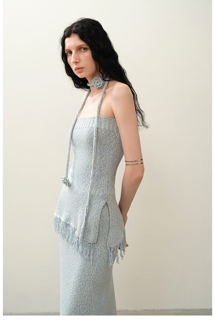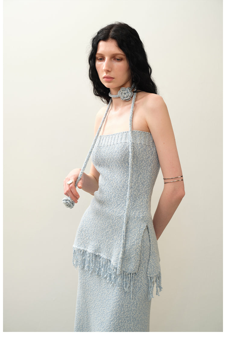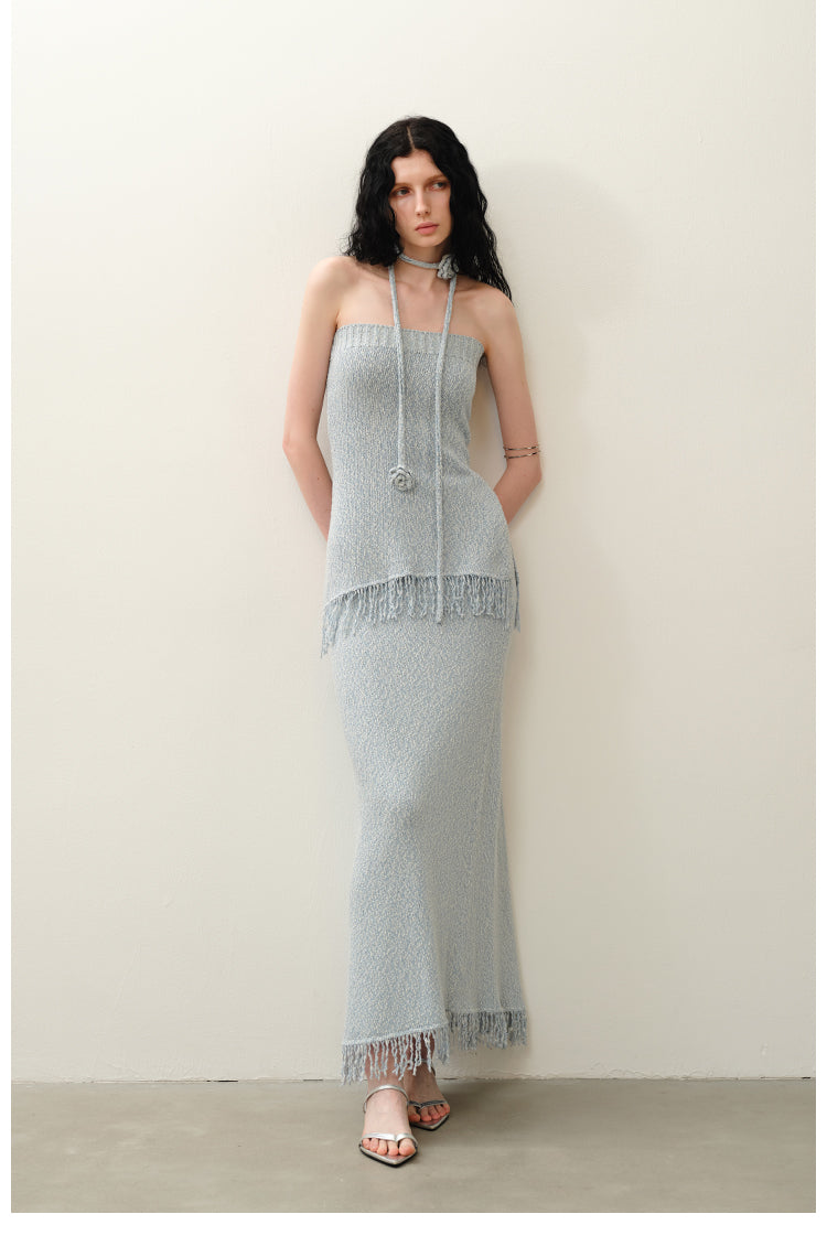 블루 크로셰 태슬 스트랩리스 스커트 세트