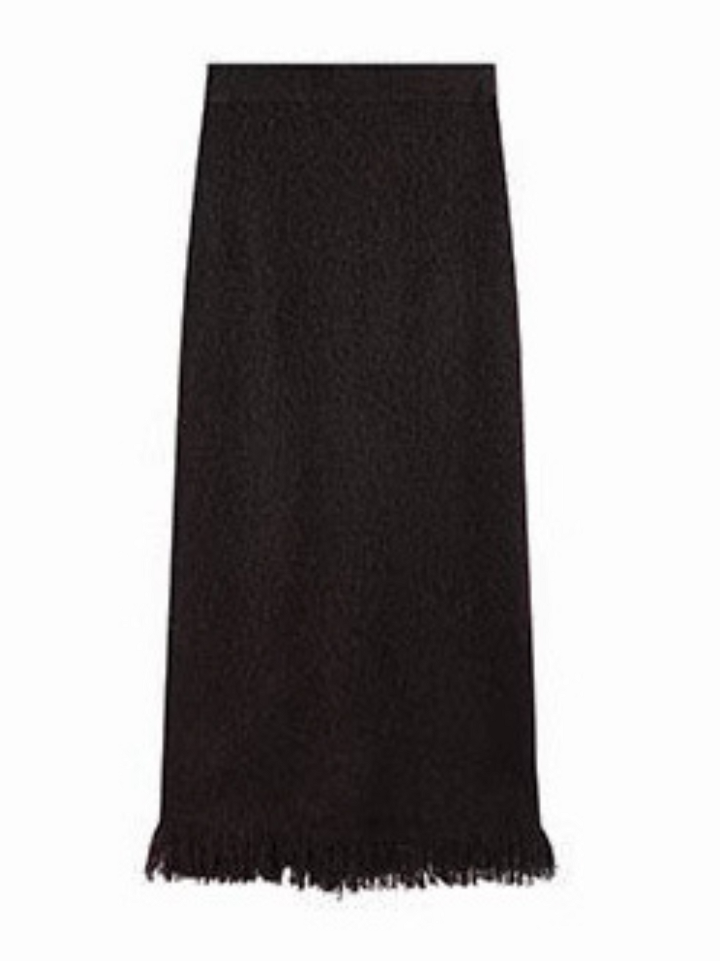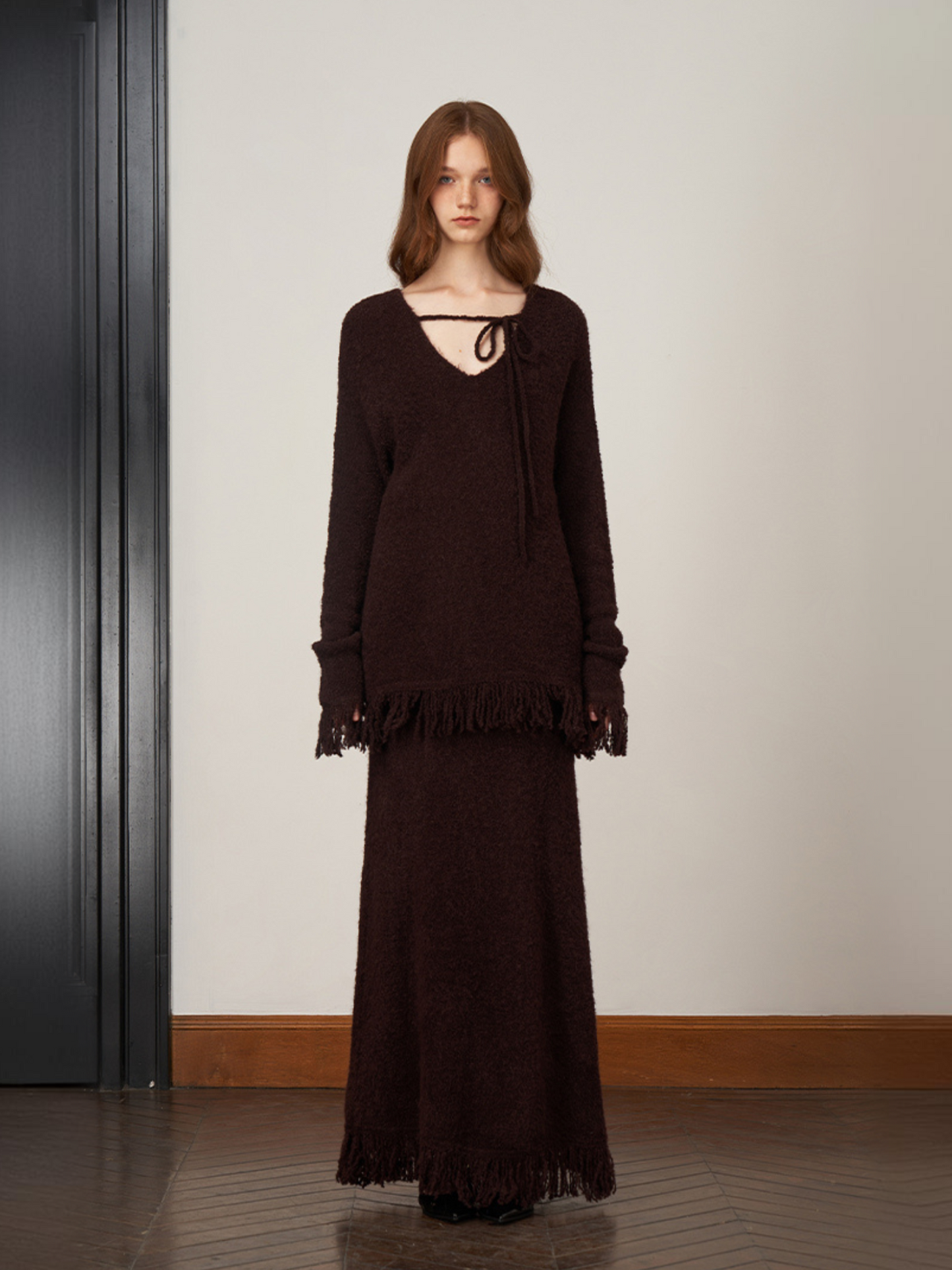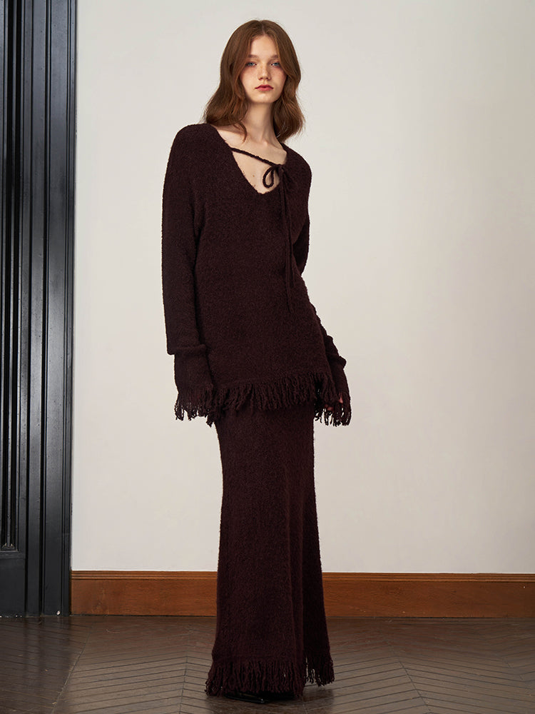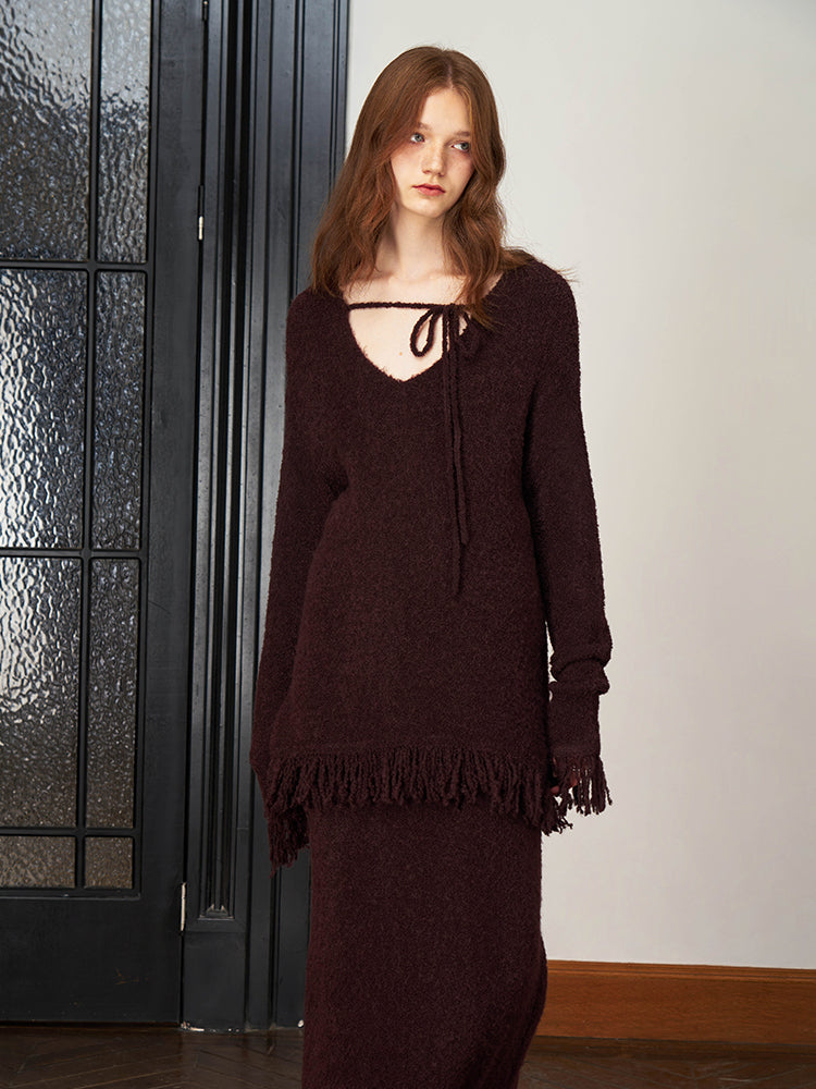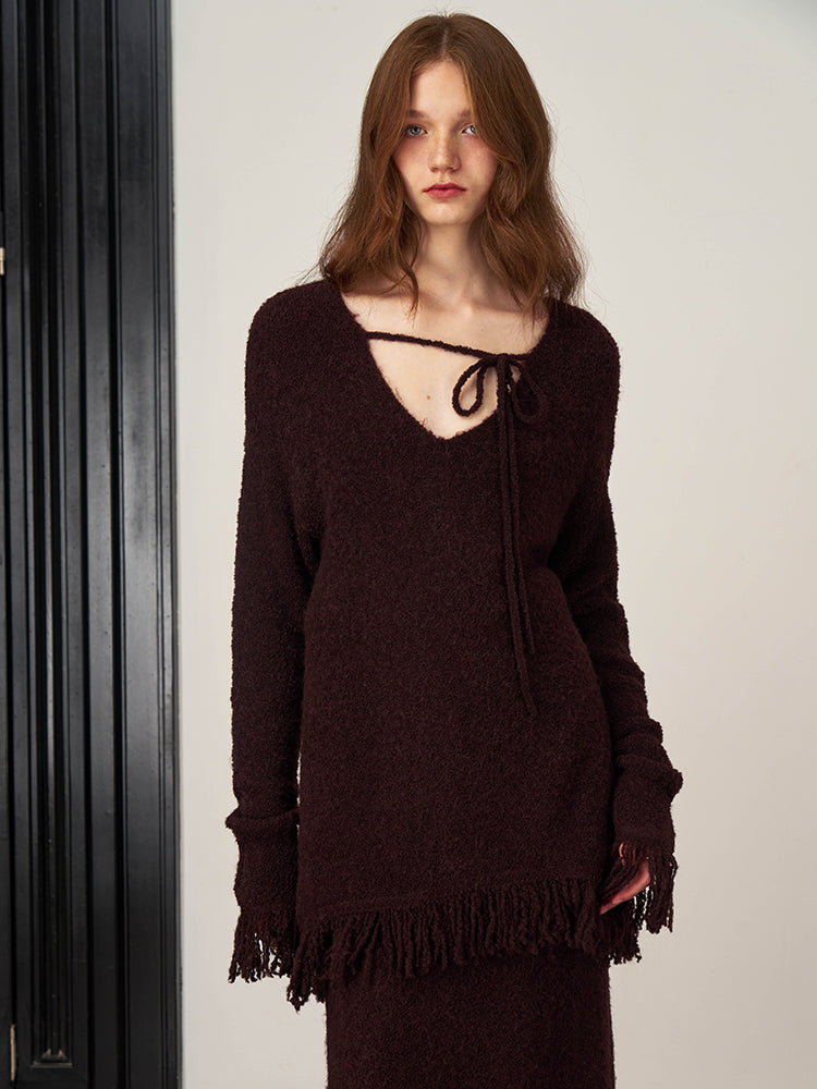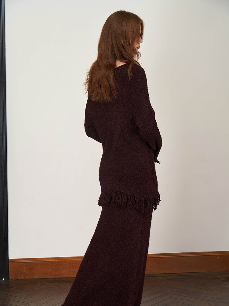 Caramel Wool Bouclé Yarn Tassel V-Neck Relaxed Sweater Set