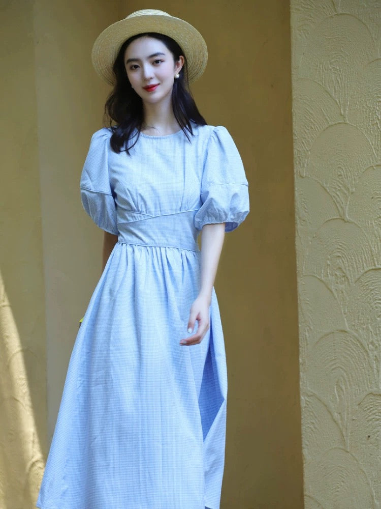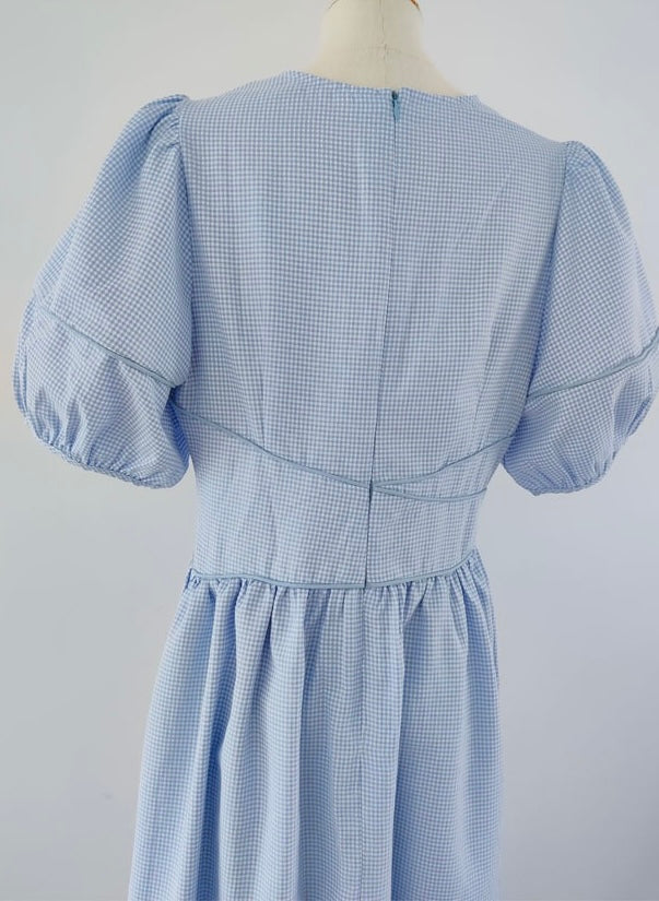- 라운드 네크라인, 퍼프 소매, 지퍼 여밈